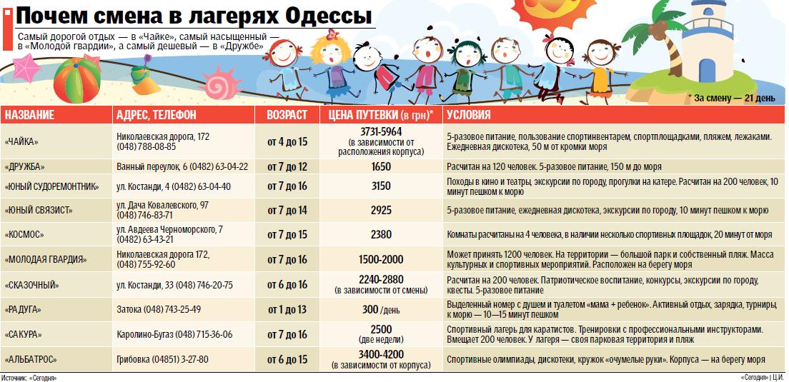С окончанием учебного года не у дел остались школьники. Однако свои двери уже распахнули детские лагеря. Мы выяснили, почем в этом году детский отдых в Одессе. Как рассказала «Сегодня» начальник облуправления образования и науки Татьяна Лазарева, в этом году на территории города и области функционирует 830 дневных и 126 круглосуточных детских лагерей. «Сейчас оздоровление получают уже 99 тысяч детей, а к концу года это число составит 108 тысяч. Из них будет немало детей из других регионов, и все дети — сироты и дети, лишенные родительской опеки», — говорит Татьяна Александровна. В этом году отдых в лагере обойдется примерно на 300 гривен дороже, чем в прошлом. Так, средняя цена смены (21 день) составит 1600—2500 грн. В эту стоимость, как правило, входит 5-разовое питание, экскурсии по городу и посещение кружков на базе. Впрочем, каждый лагерь пытается завлечь детей собственной культпрограммой. К примеру, лагерь «Радуга» проведет мини-чемпионат «Евро», а в «Альбатросе» отпразднуют «День Нептуна» и конкурс «Мисс и мистер». Руководство «Сказочного» делает уклон на патриотическое воспитание — для детей тут проводят квесты, выезды на военные полигоны и в катакомбы. Самые популярные места отдыха для детей, по заверениям Татьяны Лазаревой, это «Алые паруса» в Белгороде-Днестровском, признанные в 2010-м лучшим коммунальным оздоровительным учреждением, и лагерь «Виктория» для сирот на Даче Ковалевского, который только недавно отремонтировали. Особняком среди одесских лагерей стоит база семейного отдыха «Радуга». Оказывается, это единственный лагерь в Одессе для грудничков — тут дети могут отдыхать вместе с родителями. ЛАГЕРЬ-ЛЕГЕНДА. И все же пальму первенства по популярности получает советский лагерь «Молодая гвардия». В этом году тут полностью прекратили продажу путевок, отдав право их распределения Министерству социальной политики. Как правило, в «Молодую гвардию» попадают дети-сироты, малоимущие, победители всевозможных конкурсов и олимпиад, а также участники фестивалей. В зависимости от этого и определяется цена путевки в лагерь. Как рассказала нам начальник организационного-программного отдела «Молодой гвардии» Татьяна Бакова, в этом году у них — стопроцентная загрузка. «К нам едут дети со всей Украины, так что статус всеукраинского центра остается за нами», — говорит Татьяна Николаевна. За лето лагерь посещают 4400 детей. Каждый день здесь насыщен событиями — это и прогулки на катере, и экскурсии в цирк, зоопарк, дельфинарий. Посещают лагерь знаменитые звезды и спортсмены. К примеру, в прошлом году мастер-класс по плаванию для ребятни провел чемпион мира Денис Силантьев. Встречались с детьми певец и композитор Олег Марцинсковский и народный артист Украины Николай Свидюк, визитной карточкой которого вот уже сколько лет является песня «Доня моя, донечка...». «Кто будет в этом году, пока не известно, — говорит Татьяна Бакова. — А еще у нас ежегодно проходят два фестиваля: «Мы дети твои, Украина» и «Мир талантов». РЕЙД. Как раз сейчас чиновники вкупе с врачами санстанции и пожарными проводят проверку детских лагерей. По словам Татьяны Лазаревой, проверяется качество питания, содержания деток и уровень воспитательной работы. «Мы общаемся с детьми, с вожатыми. Такие проверки будут проводиться на постоянной основе», — говорит начальник обл