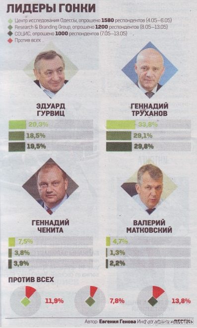 Предвыборная кампания на финише. Против главных кандидатов задействован компромат — Труханова обвинили в двойном гражданстве, а людей Гурвица — в организации беспорядков 2 мая Предвыборная мэрская гонка выходит на финишную прямую — до выборов остается пять дней. Кандидаты используют в своих кампаниях всевозможные способы убедить избирателей в своей значимости и превосходстве над другими, порой не самые порядочные. О том, что агитация будет вестись жестко, эксперты говорили с самого начала: некоторые претенденты на кресло мэра начали пиариться еще до регистрации в теризбиркоме: другие предлагают избирателям бесплатные услуги, продукты и даже медпрепарата (например, аптечки для пенсионеров): третьи соревнуются в том, кто откроет больше спортивных и детских площадок. «Эта кампания вполне могла бы стать прозрачной и честной, предпосылки для этого были, но, к сожалению, не стала Правда, мы и не видим такого количества грязных предвыборных технологий и массового подкупа избирателей, как это было в 2010 году: Этому есть две причины: сейчас мы не выбираем депутатов горсовета, значит, кандидатов в разы меньше. И второе — у тех, кто грешил подкупом избирателей, теперь намного меньше влиянш и административных рычагов», — рассказал «Вестям» руководитель Одесской облорганизации Комитета избирателей Украины Анатолий Бойко. С ним согласен политолог Кость Бондаренко. «В Одессе редкая избирательная кампания проходит без серьезных обвинений, которыми обменива-к тся кандидаты. Сейчас вдет борьба киевских политиков за то, чей человек станет хозяином Южной Пальмиры, и она еще более серьезная, чем борьба за мэра Киева Одесса — это серьезный промышленный ресурс, это порт, это припортовый завод, а потому и применяются грязные политтехнологии», — рассказал он. Политолог , также не исключил, что после 25 мая Одессу вполне могут ждать суды: «Проигравшая сторона может обжаловать итоги выборов, и ситуация станет патовой, а город будет без мэра». РОССИЙСКИЕ ПАСПОРТА И 2 МАЯ Как и прогнозирован «Вести», основная борьба развернулась между Эдуардом Гурвицем и Геннадием Трухановым. Буквально вчера в адрес обоих кандидатов прозвучали серьезные обвинения, и эту синхронность вряд ли можно назвать случайной. Гурвиц заявил о том, что у него есть данные о двойном гражданстве Труханова и предоставил копии документов, которые якобы подтверждают, что Труханов имеет российский паспорт. В пресс-службе Труханова ситуацию с документами назвали бредом: «У Геннадия Леонидовича единственный паспорт и он украинский. Учитывая, что это сообщение появилось за несколько дней до выборов — явно пытаются использовать старые методы, из девяностых». В то же время народный депутат от партии УДАР (Гурвиц также депутат этой партии) Сергей Кашин подал обращение в ЦИК, Генпрокуратуру и МВД с требованием снять Труханова с выборов. Впрочем, как пояснили в КИУ, даже если эта информация подтвердится, прямых юридических последствий для Труханова не будет. «Для того чтобы его снять, нужно решение суда, его должны лишить украинского гражданства. Учитывая принцип работы наших судов, если будет такая политическая воля, такое решение могут принять, но вряд ли это произойдет до выборов. А вот если он выиграет выборы, то с принятием присяги госслужащего проблемы возникнут», — говорит Бойк