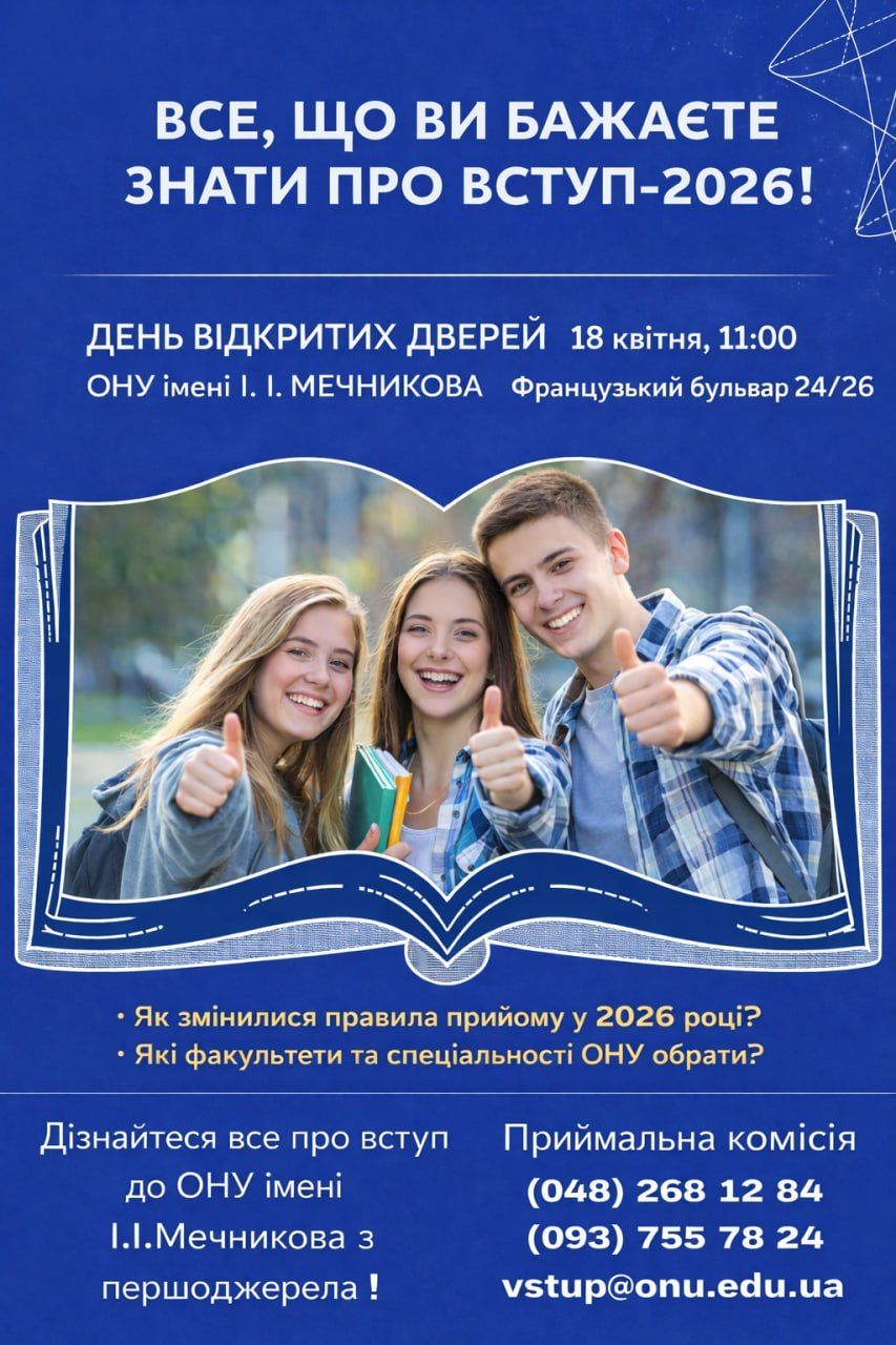 ОДЕСА, 15 КВІТНЯ 2026 РОКУ, КОНТЕКСТ-ПРИЧОРНОМОР’Я – У корпусі Одеського Національного університету імені І. І. Мечникова, розташованому по Французькому бульвару 24/26 в суботу, 18 квітня, заплановано День відкритих дверей. Як передає кореспондент ІА «Контекст-Причорномор'я», про це повідомляється на Фейсбук-сторінці «Новини Одеського університету». В повідомленні вузу сказано: День відкритих дверей в ОНУ імені Мечникова 18 квітня об 11:00 запрошуємо абітурієнтів, батьків і всіх, хто бажає стати студентом ОНУ на День відкритих дверей. 📍 Французький бульвар, 24/26 На вас чекає знайомство з факультетами, освітніми програмами, правилами вступу та можливостями, які відкриває навчання в #ОНУМечникова. Це можливість відчути атмосферу університету та зробити перший крок до майбутньої професії та студентського життя! Чекаємо на вас! |