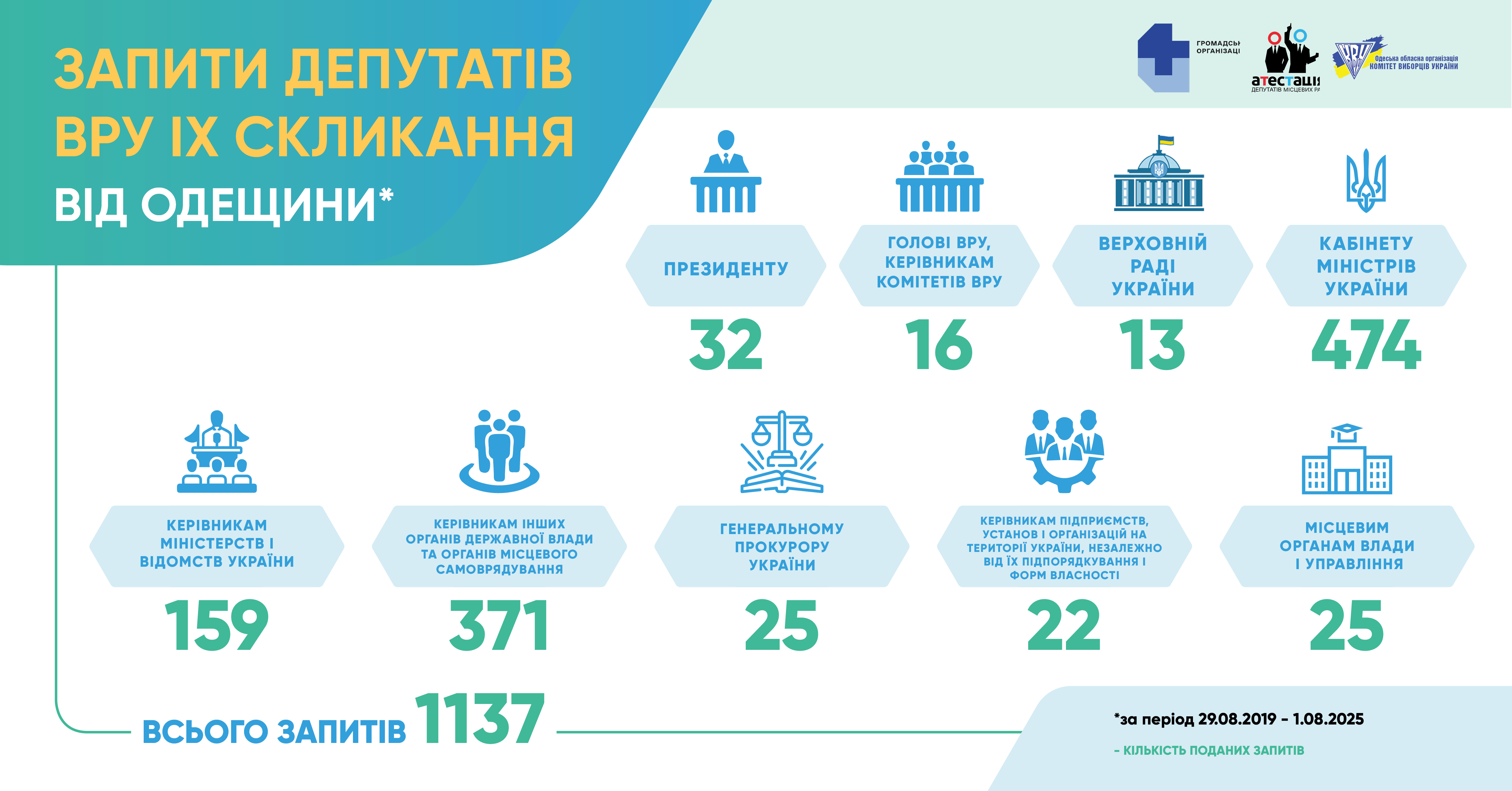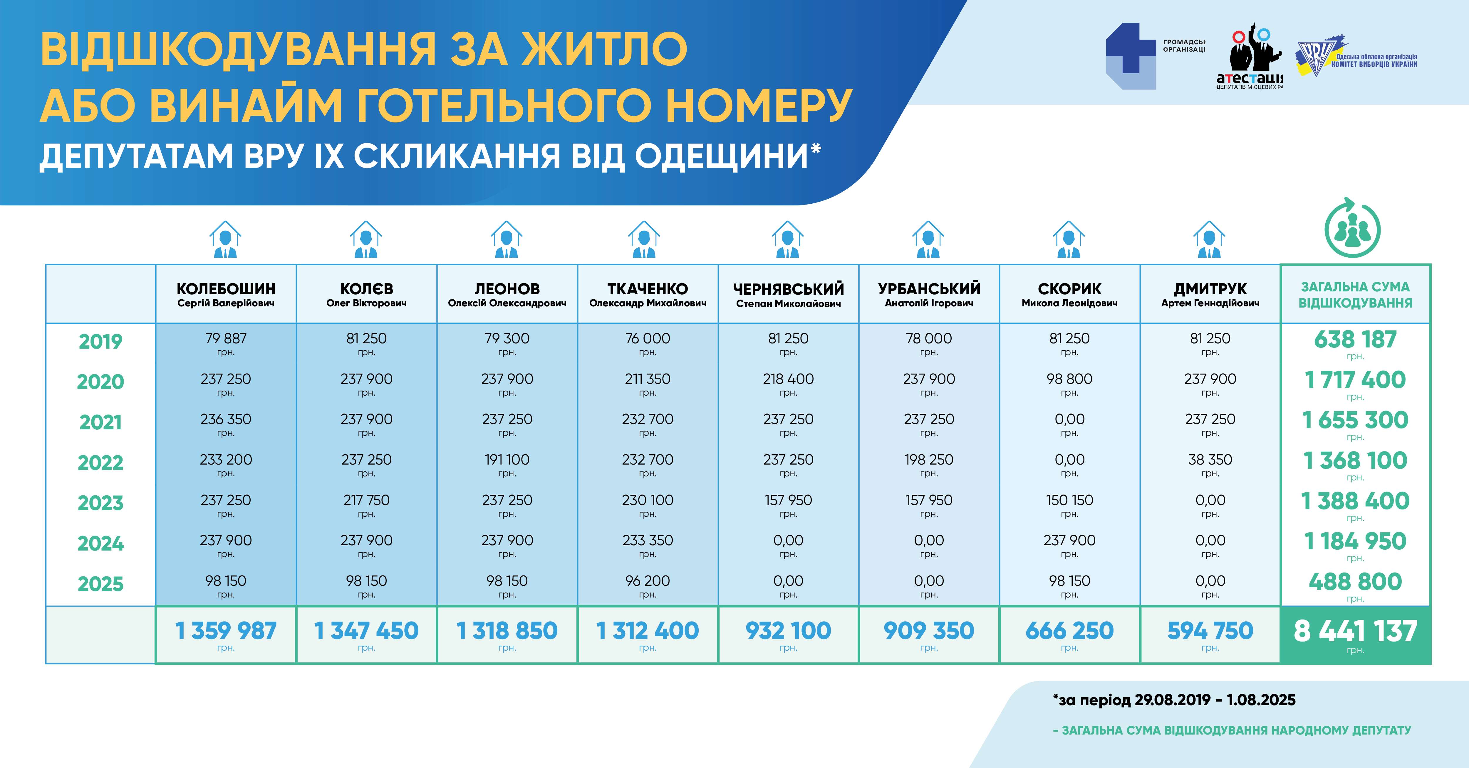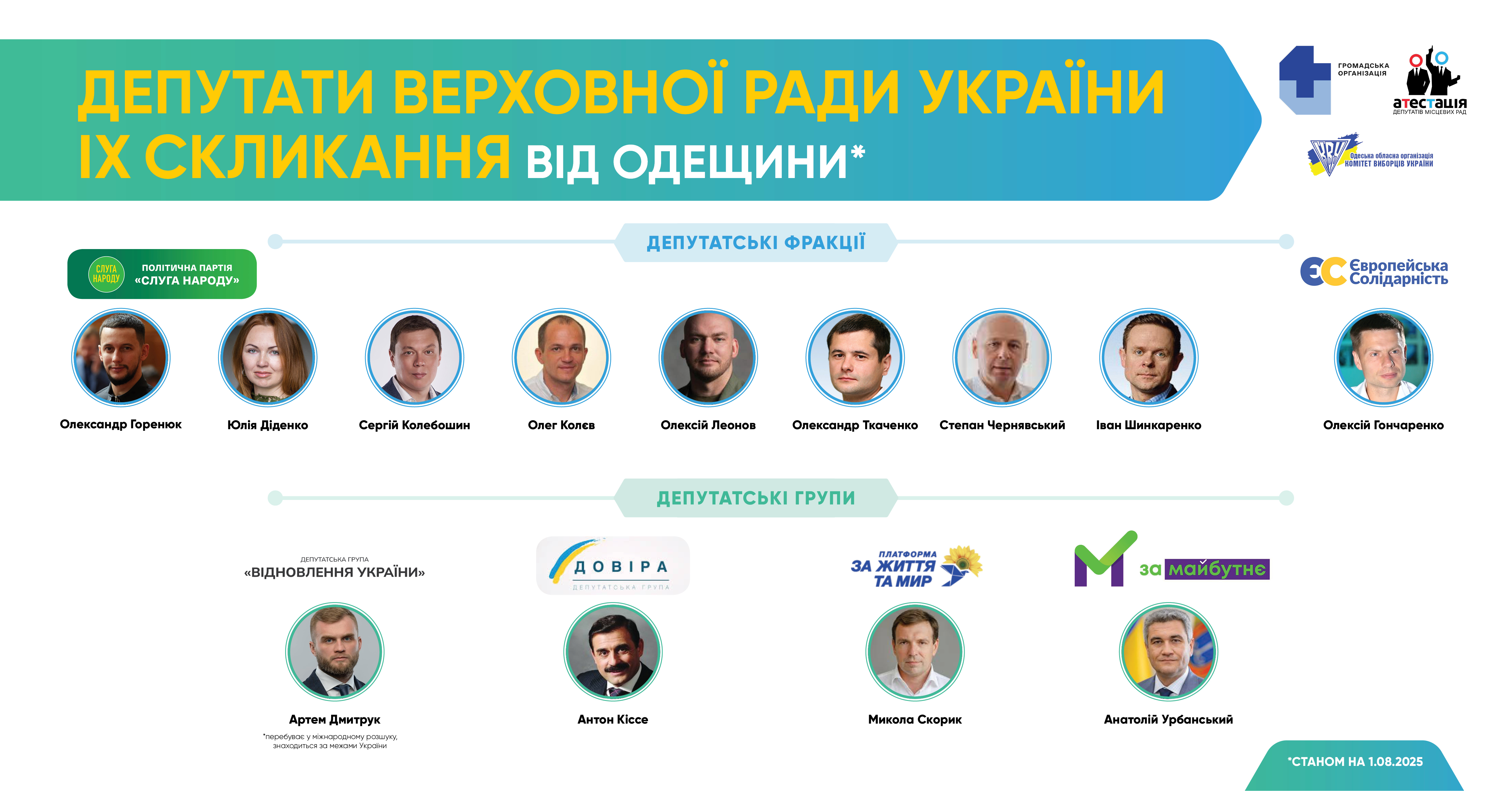 Упродовж шести років роботи у Верховній Раді (з серпня 2019-го по серпень 2025-го) обрані від Одещини народні депутати найменше приділяли уваги роботі з виборцями, а найбільше — виступам у сесійній залі. Про це свідчать результати моніторингу, який провела експертна команда Всеукраїнської громадської кампанії «Атестація депутатів місцевих рад», яку координує Одеський Комітет виборців України. Згідно з даними аналітичного звіту, за шість років роботи Верховної Ради народні депутати від Одещини продемонстрували суттєву активність у парламентській діяльності, однак у їхній роботі зафіксовано значні диспропорції: висока залученість окремих обранців та фактична пасивність інших. Крім того, нардепи мало приділяли уваги безпосередній роботі з виборцями, а їхня законотворчість здебільшого не мала локального виміру. За шість років парламент ухвалив 29% законодавчих ініціатив, поданих народними депутатами з Одещини: всього парламентарі від Одеси та області зареєстрували 1754 законопроєктів, а чинними актами стали 502 ініціативи. Найбільше поданих ініціатив — у Олексія Гончаренка (308), хоча прийнято з них лише 40. За кількістю затверджених законодавчих ініціатив лідирує Сергій Колебошин: 96 ухвалених актів із 164 зареєстрованих проєктів. Лише троє депутатів скористались правом подання депутатського запиту у 2025 році: Олексій Гончаренко, Олександр Ткаченко та Іван Шинкаренко. Найбільшу кількість запитів протягом всієї каденції підготував Олександр Ткаченко: 538 (або 47% від загальної кількості запитів, поданих всіма одеськими обранцями). Упродовж шестирічного періоду народні депутати від Одещини виступали 1561 раз, причому основний обсяг промов (понад 80%) належить Олексію Гончаренку (1241 виступ). Інші обранці демонструють значно нижчу активність: друге місце займає Микола Скорик зі 155 виступами. Жодного разу за останній рік роботи не брали слово Олександр Горенюк, Юлія Діденко, Артем Дмитрук, Олег Колєв, Степан Чернявський та Іван Шинкаренко. У середньому одеські депутати взяли участь у 72% голосувань за весь період роботи парламенту. Лідером за кількістю голосувань впродовж останнього року, як і минулоріч, залишається Олег Колєв, який взяв участь у 94% з них. Найменшу кількість голосувань зафіксовано у Анатолія Урбанського, який взяв участь лише в 50% голосувань. Найчастіше не голосував протягом шести років Олексій Гончаренко — 27%. Найбільше був відсутнім під час голосувань Микола Скорик: він пропустив 35% з них. Більшість обранців ведуть комунікацію через соцмережі та рідко інформують про особисті прийоми громадян. Аналіз показав, що комунікація народних депутатів від Одеської області з виборцями залишається обмеженою, переважно односторонньою та сконцентрованою на цифрових платформах.. Основним майданчиком залишається facebook. Особисті прийоми громадян та інформація про них є обмеженими, графік прийомів та адрес приймалень більшості депутатів — відсутній. На сайті Ради можна знайти тільки стаціонарні номери телефонів та електронні пошти обранців, а у соціальних мережах окремих депутатів — додаткові засоби звʼязку. Загальна сума доходу, задекларована народними обранцями як заробітна плата за шість років, сягає 39,1 млн грн. У якості компенсації оренди житла або винайму готельного номера вісім з 13 народних депутатів за період з 2019 року п