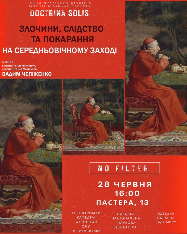 ![]() 28 червня 2025 року в Одеській національній науковій бібліотеці, в рамках публічного освітнього філософського проєкту Доктрина Соліс, за підтримки Одеської обласної Ради Миру та кафедри філософії ОНУ ім. І.І.Мечникова відбудеться лекція-дискусія за участі кандидата історичних наук, доцента ОНУ ім. І.І.Мечникова Вадима Чепіженка «Злочини, слідство та покарання на середньовічному Заході».