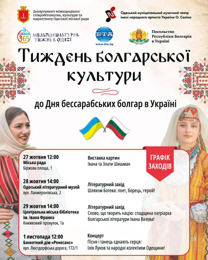 ![]() З 27 жовтня по 1 листопада 2025 року в багатонаціональній Одесі відбудеться Тиждень болгарської культури, присвячений Дню бессарабських болгар в Україні. Програма тижня охоплює мистецькі виставки, літературні зустрічі та великий святковий концерт: 📅 27 жовтня 2025 року, 12:00 Місце: Одеська міська рада Подія: Відкриття Тижня болгарської культури. Виставка картин Івана та Злати Шишман – сучасних болгарських митців, чиї роботи поєднують традиційні мотиви та сучасне бачення болгарської душі. 📅 28 жовтня 2025 року, 14:00 Місце: Одеський літературний музей (вул. Ланжеронівська, 2) Подія: Літературно-історичний захід «Шляхом Ботева: поет, борець, герой!»/«По пътя на Христо Ботев: поет, борец, герой!» Присвячено постаті Христо Ботева – поета, революціонера, символу свободи болгарського народу. 📅 29 жовтня 2025 року, 14:00 Місце: Центральна міська бібліотека ім. Івана Франка (Книжковий провулок, 1а) Подія: Культурна зустріч та виставка книг «Слово, що творить націю: спадщина патріарха болгарської літератури Івана Вазова!» «Словото, което изгражда нация: наследството на патриарха на българската литература Иван Вазов!» Вшанування патріарха болгарської літератури, його впливу на національну самосвідомість і духовність. 📅 1 листопада 2025 року, 12:00 Місце: Банкетний дім «Ренесанс» (вул. Люстдорфська дорога, 172/1) Подія: Урочистий святковий концерт «Пісня і танець єднають серця: Ілія Луков та народні колективи Одещини» «Песента и танцът обединяват сърцата: Илия Луков и фолклорни състави от Одеска област!» На сцені виступатиме легенда болгарської народної музики Ілія Луков, а також фольклорні ансамблі болгарських громад Одеської області. Організатори: Департамент міжнародного співробітництва, культури та маркетингу Одеської міської ради, Генеральне консульство Республіки Болгарія в Одесі, Одеський муніципальний музичний театр імені народного артиста України О. Саліка, Болгарське телеграфне агентство. |