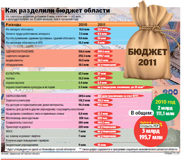 Бюждет-2011: Дефицит казны – 2 млн., помощь государства – 100 млн. на дороги Накануне Нового года, 31 декабря, депутаты Одесского облсовета приняли бюджет области на 2011-й. Пока, правда, речь идет лишь о первом этапе бюджетного процесса — утверждены только общие показатели и статьи, касающиеся финансирования бюджетных учреждений. Оставшиеся средства распределят на одной из ближайших сессий. Преимуществ у новой «финансовой конституции», утверждают в финуправлении ОГА, несколько. Во-первых, по сравнению с прошлым годом, смета увеличилась больше чем в полтора раза. Во-вторых, она почти бездефицитная — расходы превышают доходы всего на 2 млн грн. Для сравнения: в бюджете-2010 дефицит, утвержденный депутатами, составлял более 30 млн, а его реальная цифра оказалась еще выше (дело в том, что государство выполнило далеко не все свои обязательства перед областью, например, 500 тыс. недополучило управление охраны памятников. — Авт.). В-третьих, если все сложится удачно, то уже к весне документ пересмотрят в сторону увеличения — Кабмин предварительно согласился выделить около 100 млн на дороги, 76 млн на достройку 8 школ, которые начали делать еще при СССР; профинансировать возведение нового Дворца спорта и другие амбициозные проекты областной власти. Кроме того, депутаты на 2 млн сократили расходы на свой аппарат, зато увеличили траты на обслуживание админзданий. По словам главы облсовета Николая Пундика, 1-й корпус (на пр. Шевченко) нуждается в серьезном ремонте. «Лучше, конечно, вообще новое здание построить, но на это никто не пойдет», — сказал он. Меньше выделили здравоохранению — почти на 60 млн, — но на зарплатах медработников это не отразится. Депутаты предусмотрели для людей в белых халатах 299,7 млн, что на 7 млн больше прошлогоднего. Любопытно, что программа социально-экономического развития области на 2011-й предусматривает сокращение сети медучреждений — их станет 114 против 119-ти сейчас. Пять больниц в селах ликвидируют в результате реформы сферы. Зато образовательная статья «подросла» на 121 млн, в основном за счет ПТУ, которые были переданы государством облсоветам с соответствующим финансированием. Провластное большинство считает бюджет успешным, а оппозиция окрестила его «бюджетом обнищания». «Он верстался на скорую руку, без учета реального уровня инфляции», — полагает глава фракции «Батькивщина» Сергей Веселов. А депутат от «Сильной Украины», экономист Николай Шутов, уверен, что бюджет не решает проблем убыточных предприятий, а зарплату и дальше будут платить «в конвертах». Кроме того, в нем сильно занижена цифра доходов КП. Иными словами, регион, если выйдет из «тени», может заработать гораздо больше, чем запланировал облсовет. ГОРОДСКОЙ БЮДЖЕТ БУДЕТ БЕЗДЕФИЦИТНЫМ Завтра свой бюджет обретет и Одесса — его проект, уже согласованный исполкомом, горсовет рассмотрит на внеочередной сессии, которая начнется в 11.00. Если в документ не внесут существенных изменений, то в этом году город планирует заработать 2 млрд 281 млн грн. (в 2010-м собирались получить 3,2 миллиарда, но выполнили смету всего на 67%). Потратит громада на 300 тыс. меньше, т.е., бюджет будет бездефицитным. Как рассказала начальник департамента финансов мэрии Светлана Бедрега, смета сформирована с учетом новых Бюджетного и Налогового кодексов. Кроме всего прочего, в бюджете предусмотрены 