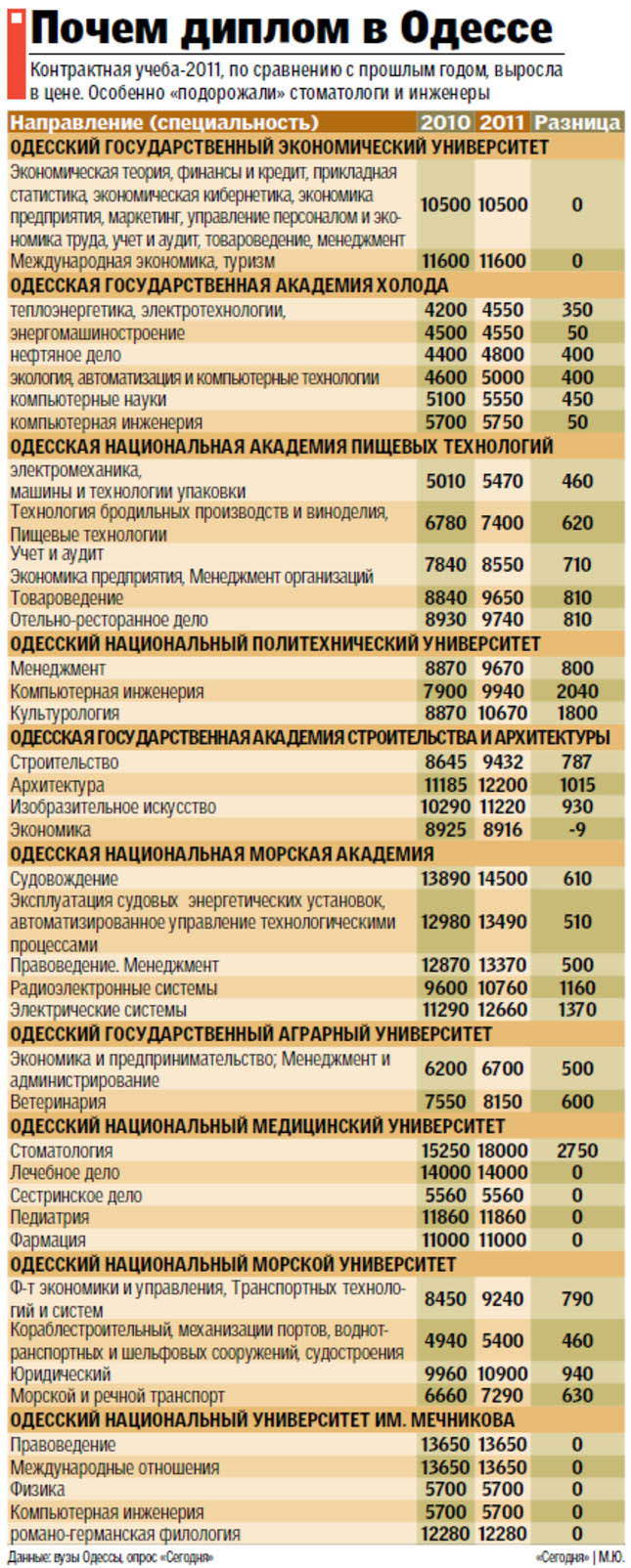 Одесские вузы завлекают абитуру рабочими специальностями и гарантией трудоустройства Очень скоро в одесских вузах стартует вступительная кампания. И сейчас бывшие школьники определяются с альма-матер, куда пойдут грызть гранит науки. Правда, в этом году попотеть придется не абитуриентам, а университетам и академиям, поскольку количество выпускников, по сравнению с прошлым годом, снизилось почти втрое: в 2011-м школьную скамью покинули всего 1924 одиннадцатиклассника, тогда как в 2010-м — 6000 учеников. То есть конкуренция между абитуриентами грозит смениться конкуренцией вузов. Готовиться к борьбе за будущих студентов наши учебные заведения начали еще осенью. Покорять сердца одесситов планируют новыми специальностями, гарантией трудоустройства и даже... ноутбуками. Большинство вузов подняли в этом году цены на контрактное обучение — в основном на самые топовые специальности: мол, нужно же за какие-то деньги содержать институт. Но некоторые учебные заведения, побоявшись дефицита экс-школьников, решили с поднятием стоимости повременить. В частности, не повышал цены Университет внутренних дел. На контракте там обучают правоведов (милиционеры — все бюджетники. — Авт.). Вот уже несколько лет подряд, и 2011-й — не исключение, год учебы здесь стоит 12 тыс. грн. Боится отпугнуть желающих погрызть гранит науки высокими ценами и единственный в городе классический Университет имени Мечникова — цены на контракт здесь не поднялись ни на одной специальности. А некоторые вузы даже ввели новую систему оплаты. «В последнее время наши студенты стали жаловаться, что при нынешнем экономическом положении оплачивать контракт на год или даже на семестр вперед очень сложно. С этого года, для удобства студентов, оплата будет поквартальной», — говорят в приемной комиссии Строительной академии. В Юракадемии и Медуниверситете не переживают, что их аудитории будут пустовать. Конкурс в этих вузах ежегодно составляет порядка 5—10 человек на место. «О недоборе речи даже не идет. Зато в этом году у абитуриентов есть возможность поступить не просто куда получится, а куда действительно хочется, — говорит ректор Медицинского университета Валерий Запорожан. — К тому же мы занимаем лидирующую позицию среди одесских вузов по количеству иностранных студентов. Второе место по этому показателю с небольшим разрывом от нас занимает ОНУ им. Мечникова». К слову, несмотря на престижность медицинского образования, в этом году Медуниверситет также отказался от повышения стоимости обучения, правда, связывают это вовсе не с дефицитом студентов. «Мы рассчитываем стоимость контрактов исходя из расходов на обучение. В этом году стоимость поднялись только по одной специальности — стоматологии», — поясняет руководитель медина. Цена контракта для будущих зубных врачей выросла почти на 3 тыс. грн. и составляет 18 тыс. грн. в год. Нынче это самая дорогая специальность в Одессе! А вот один из самых крупных вузов — Политех, который ежегодно набирает студентов на 63 специальности, от повышения не отказался (в среднем, стоимость контракта в ОНПУ выросла на 1,5—2 тыс. грн. за год) и даже ввел две новые специальности — «теплоэнергетика» и «радиотехника». Не боятся политехники завлекать молодежь в свои аудитории и совсем уж «экзотическими» методами. Например, с этого года вуз дает возможн