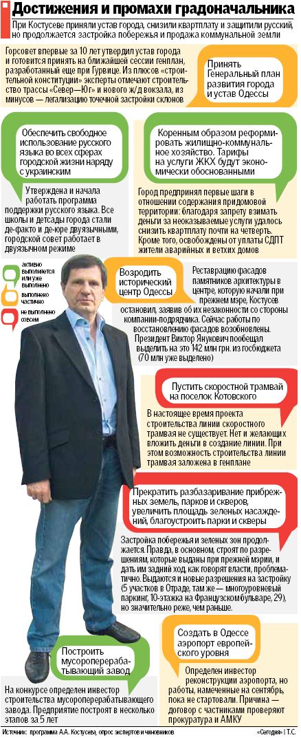 Годовые итоги. Эксперты: мэр снизил квартплату и защитил русский язык, но не остановил застройку побережья На днях исполнился год с того момента, как в Одессе поменялась власть. Эдуард Гурвиц, проиграв на выборах, уступил кресло на Думской своему давнему сопернику — Алексею Костусеву. «Сегодня», опросив экспертов, выяснила, что удалось сделать, а что не получилось за год правления нового городского головы. ПЛЮСЫ. По мнению одесского политолога Василия Зырянского, главные плюсы мэрства Костусева — 25-процентное снижение квартплаты одесситов и отказ от взимания квартплаты с жителей аварийных и ветхих домов. «Я, например, экономлю каждый месяц на этом 100—150 грн.», — утверждает эксперт. Еще одно грамотное решение Костусева, по мнению Зырянского, — это языковая политика, то есть принятие программы поддержки русского языка. «Тут он попал в точку. Количество русских классов в школах и русских групп в детсадах выросло, начали приобретать учебники на русском, горсовет публикует свои решения на двух языках. При этом, что очень важно, защита русского не обернулась нарушением прав украиноязычных, то есть мэр сумел выдержать золотую середину в этом весьма деликатном вопросе», — говорит Зырянский. А эксперт-экономист Андрей Гишко уверяет, что главное достижение Костусева — принятие Устава города. «Без принятия «городской конституции» функции исполнительной и законодательной ветвей одесской власти, права самих одесситов были расплывчаты. А это — очевидный шаг вперед, ведь разговоры об уставе ведутся уже последних лет 10. И многие чиновники на этом пиарились», — утверждает специалист. А сейчас, продолжает Гишко, основная задача Костусева — не допустить срыва отопительного сезона в Одессе, ведь счета КП «Теплоснабжение» пытаются заблокировать банки-кредиторы. «Я знаю, что Костусев не сидит на месте, а решает в Киеве вопрос о том, чтобы Одессу не отрезали от тепла и горячей воды», — подчеркивает экономист. МИНУСЫ. По мнению доктора экономических наук Николая Шутова, год мэрства Костусева не увенчался откровенными удачами или промахами. Но в этом эксперт видит вину подчиненных мэра. «Экономика Одессы не ухудшилась, но и не улучшилась. Костусеву мешает кадровая чехарда в мэрии. У него нет грамотных и профессиональных управленцев — хозяйственников и экономистов. Поэтому многие документы, которые подписывает мэр, недоработаны», — критикует Шутов. Как пример, экономист называет передачу 75% акций аэропорта в частные руки: мол, неясно, какая выгода от этой сделки будет городу. «В минусах — и отсутствие обоснованной стратегии кредитования города (как сказал нам сам Костусев, такая программа сейчас разрабатывается. — Авт.). За год Одесса не взяла ни одного кредита. Но привлекать кратко- и долгосрочные займы можно и нужно — за счет перекредитовывания можно решить самые острые и насущные городские проблемы. Просто нужно тщательно просчитывать механизмы отдачи долгов», — уточняет Шутов. По мнению экономиста Олега Ильина, в строительной и земельной сферах особых отличий от ситуации времен Боделана и Гурвица не наблюдается: «Просто политику проводят те же люди, я имею в виду профильного вице-мэра (Александр Орлов), начальников управлений и других чиновников 1-го и 2-го эшелонов. Продолжается реализация откровенно незаконных проектов, вроде возве