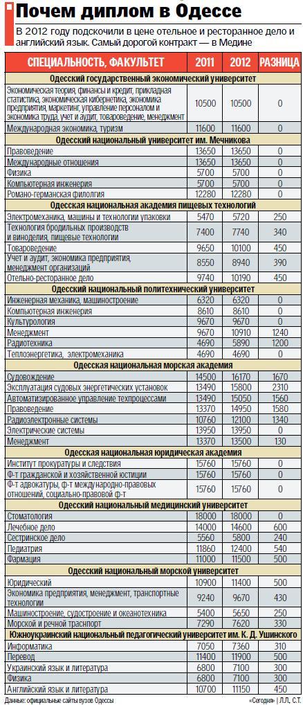 Самые дорогие в Одессе — капитан и стоматолог, а государство поможет технарям Нынешняя вступительная кампания отличается довольно сжатыми сроками. Из-за Евро-2012 график работы приемных комиссий немного сдвинулся на более раннее время, потому у абитуриентов осталось совсем немного времени, чтобы определиться с выбором. Для тех, кто не до конца уверен в собственных силах или хочет перестраховаться, не лишним будет подсчитать, сколько придется заплатить за диплом в случае, если не повезет обучаться за счет государства. В нынешнем году число желающих получить высшее образование, по сравнению с «безлюдным» прошлым годом, значительно выросло и почти сравнялось с позапрошлогодним. КОНКУРЕНЦИЯ. По данным Регионального центра оценивания качества образования, «штурмовать» приемные комиссии будет процентов на 30 больше абитуриентов, чем в 2011-м. «Если в прошлом году в Одесской, Николаевской и Кировоградской областях аттестаты о полном среднем образовании получили 23 000 выпускников, то в этом 31 000», — рассказал нам директор центра Анатолий Анисимов. А это значит, что и конкуренция между абитуриентами повысится. Причем не только на бюджетную, но и на контрактную форму обучения. «По утвержденным Кабмином правилам приема проходной балл по проходной дисциплине поднят со 124 до 140 и даже выше, на усмотрение вуза», — говорит председатель совета ректоров, ректор Одесского государственного экологического университета Сергей Степаненко. ТЕХНАРИ. Наибольшим спросом в этом учебном году будут пользоваться технические и естественно-научные специальности. Об этом свидетельствует динамика регистрации на внешнее независимое оценивание. «Все больше выпускников предпочитают тесты по математике. В этом году число тестируемых по этому предмету впервые превысило число тех, кто проходит оценивание по истории Украины. Это говорит о том, что у абитуры акцент сместился с гуманитарных профессий на технические», — говорит Анатолий Анисимов. Кроме того, айтишники, физики и прочие негуманитарии по-прежнему в фаворе у государства в плане получения госзаказа и льготных условий поступления, говорят в совете ректоров. Тем же, кому не посчастливилось попасть на бюджет, придется серьезно раскошеливаться. Например, стоимость обучения по некоторым техническим специальностям в Политехе поднялась на 10—20%. Круче всего подорожала «радиотехника» — с 4690 до 5890 грн. Кстати, несмотря на то, что до подачи документов осталось чуть больше месяца, не все высшие заведения города технического профиля уже определились со стоимостью обучения. К примеру, в Академии холода точных данных о том, изменятся ли цены для контрактников в текущем году, пока нет. ДОРОЖЕ КАПИТАНА. Самыми дорогими по-прежнему остаются контракты в Юридической и Морской академиях, говорит председатель Совета ректоров Сергей Степаненко. Будущим капитанам за учебу теперь нужно платить по 16 170 грн, то есть на 1670 грн больше, чем в прошлом году. Остальным — от 12 до 16 тыс. грн. Пальму первенства с капитанами делят юристы. В профильной академии стоимость обучения — 15 760 грн в год на любом факультете. Дороже учебы на капитана — только контракт стоматолога, цена на него, кстати, осталась на прошлогоднем уровне. Получение самой дорогостоящей в Одессе профессии вуз по-прежнему оценивает в 18 тыс. грн. Из-за Евро — учат доро