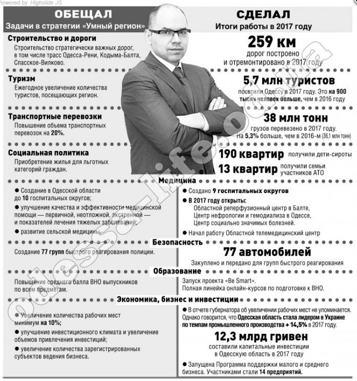 Что обещал и что сделал глава Одесской областной администрации На неделе определенную черту под своей деятельностью подвел председатель Одесской облгосадминистрации Максим Степанов. Губернатор отчитался за год работы на посту. Отметим, что стратегические направления работы обладминистрации и лично Максима Степанова были изложены в концептуальном документе с претенциозным названием «Умный регион». Его глава Одесской области презентовал в марте 2017 года. «Одесская жизнь» выясняла, какие планы реализовать удалось, а какие так и остались продекларированными на бумаге. Автор: Татьяна Сярова