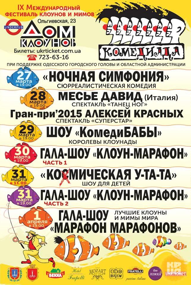 Фестиваль «Комедиада» продлится 6 дней В этом году круглая дата не только у Одесской киностудии. Юбилей празднует и знаменитая одесская комик-труппа «Маски». Вечно молодым клоунам исполняется, страшно сказать, 35 лет! В честь юбилея комики тоже разгулялись не на шутку, и фестиваль «Комедиада», который уже в 9-й раз состоится в Доме Клоунов на Ольгиевской, созданном все теми же «Масками», растянется аж на 6 дней. Кстати, и следующий год без юбилея не обойдется – внимательные читатели уже заметили, что фестиваль клоунов в 2020-м пройдет в 10-й раз. Комедиада на марше! В Одессу на «Комедиаду«приедут мимы из разных уголков мира — Японии, Венгрии, Германии, Канады, Швейцарии и других стран (Украина, разумеется, тоже широко представлена).Среди них: Месье Давид (Monsieur David), Италия, Джефф Хэсс (Jeff Hess), Германия, театр невербального юмора «УНИСОН», Россия, комик-группа «FATAMORGANA», Израиль, клоун Нана (Санае Хасимото), Япония, Рамиро Вергаз (Ramiro Vergaz), Испания, группа «Тадам», Венгрия и многие другие. В программе – спектакли, уникальные шоу, клоунская лаборатория, вечеринки, программы для детей, уличные перфомансы, карнавал и вручение специальных призов самым полюбившимся публике клоунам и коллективам. Разумеется, делегация «Комедиады» примет участие в главном параде на Дерибасовской, и в 15.30 1 апреля даст гала-концерт на главной сцене «Юморины». Автор: -