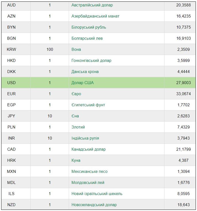 Европейская валюта возьмет очередную психологическую планку. Национальный банк Украины на понедельник, 14 сентября установил официальный курс гривны к американскому доллару на уровне 27.90 грн/$. Об этом свидетельствуют данные на сайте регулятора. Курс доллара вырастет на 7 копеек по сравнению с прошлым банковским днем. Официальный курс евро 14 сентября равняется 33.06 грн/€. Курс евро вырастет на 10 копеек и вплотную приблизился к психологической отметке. Напомним, сегодня, 11 сентября, и на выходных 12-13 сентября действуют такие официальные курсы: 27.83 грн/$ и 32.96 грн/€. Ретроспектива недели 10 сентября официальные курсы были установлены на уровне 27.82 грн/$, 32.76 грн/€. 9 сентября официальные курсы были установлены на уровне 27.80 грн/$, 32.79 грн/€. 8 сентября официальные курсы были установлены на уровне 27.75 грн/$, 32.80 грн/€. 7 сентября официальные курсы были установлены на уровне 27.69 грн/$, 32.73 грн/€. 4-6 сентября официальные курсы были установлены на уровне 27.69 грн/$, 32.73 грн/€. Гривна «сломалась» в июле 16 июля впервые за 17 месяцев евро стал стоить дороже 31 гривны. В последний раз официальный курс евро был выше 23 марта 2019 года — 31,0368 гривен за евро (теперь пройдена и эта планка). Курс поднимался к отметке в 31 гривну во время острой фазы кризиса в марте 2020 года, однако не превышал ее. Очень быстро евро «пробил» 32, т.е курс ушел за отметку 32 грневро. 3 июля доллар впервые с апреля снова пересек отметку 27 гривен, подорожав до уровня 27.18 грндоллар. Евро тоже подпрыгнул тогда более чем на 60 копеек, и курс достиг значения 30.65 грневро (до этого на протяжении двух недель евро незначительно колебался около отметки 30 грневро). Обвал национальной валюты, произошедший 3 июля, напрямую связан с известием об отставке главы НБУ Якова Смолия, который пожаловался при этом на систематическое политическое давление. Официальный курс валют НБУ на 14 сентября 2020 года. Фото: Нацбанк Украины. Что было раньше В конце марта (а именно 30 марта), американская валюта обновила планку самого высокого курса в 2020 году, достигнув уровня 28.18 грн/$. В период 2019-2020 годов лишь в январе 2019 года доллар однажды превышал этот показатель. 12 января 2019 года курс доллара был 28.27 грндоллар. Официальный курс евро 30 марта составлял 30.90 грн/€. Какими были самые низкие курсы гривны в обозримом прошлом относительно основных валют в официальных курсах НБУ? Доллар США 26 февраля 2015 года стоил 30.01 грн. Евро установил свой рекорд 26 января 2018 года — 35.66 грн. Автор: Николай ЛИСИЦЫН