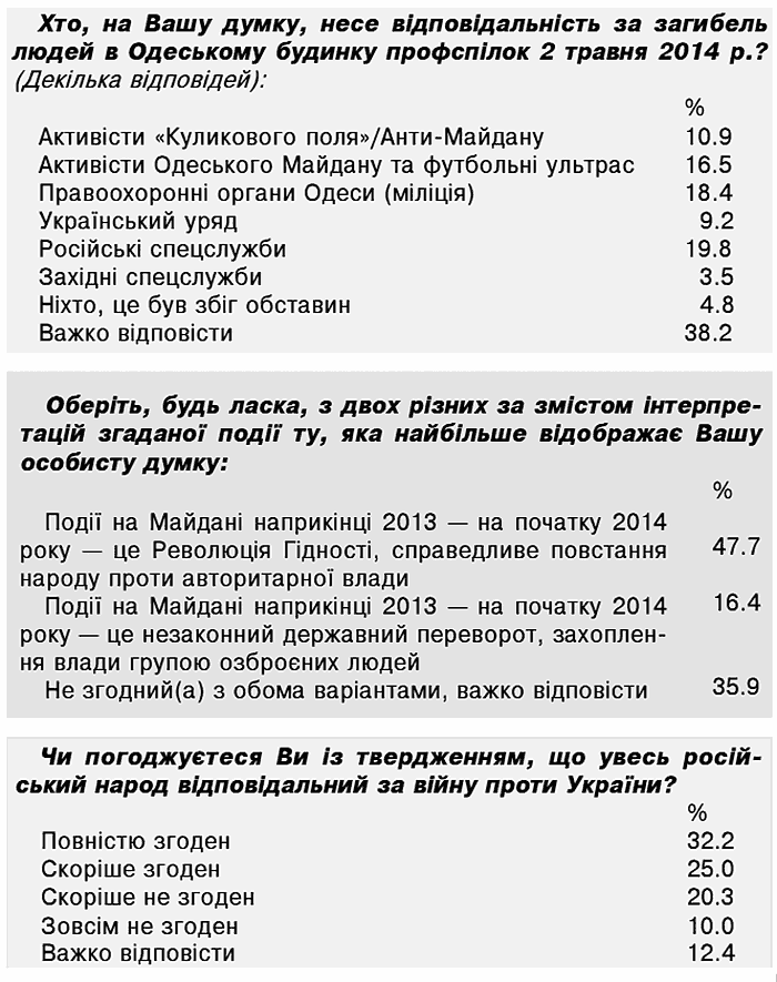 Результати нещодавнього опитування, про яке і йтиметься сьогодні, не те що приголомшили, але таки здивували. Не приголомшили, бо про існування на Одещині чималої кількості прихильників «руcского міра», як відвертих, так і принишклих, не знає тільки той, хто нічого не хоче знати. І все ж таки ці результати здивували як досить високим відсотком захисників російських наративів, так і ще більшим числом тих, хто не визначився із відповідями на поставлені питання. Що стоїть за цією невизначеністю — справді відсутність позиції щодо порушених тем чи боязнь відповісти відверто, прихована за маскою «важко відповісти» симпатія до ворога, до держави-агресорки? Отож, спочатку про результати дослідження, яке було проведене Фондом «Демократичні ініціативи» імені Ілька Кучеріва впродовж 10 —21 липня 2023 року. Загалом було опитано 708 респондентів віком від 18 років в Одеській області. Вибірка є багатоступеневою із застосуванням випадкового відбору населених пунктів на перших етапах та квотним відбором респондентів на заключному етапі. Вибіркова сукупність відтворює демографічну структуру дорослого населення Одещини станом на початок 2022-го. Максимальна випадкова похибка вибірки не перевищує 3%. Водночас, слід зважати на систематичні відхилення вибірки через вимушену міграцію мільйонів громадян, спричинену російсько-українською війною. Своє дослідження соціологи озаглавили так: «Механізми підриву безпеки через дезінформацію: приклад Одещини і стратегія РФ». Перед респондентами вони поставили, зокрема, такі питання й отримали ось які результати. Щодо відповідальності за загибель в Одеському будинку профспілок, то, як зауважують автори дослідження, розподіл думок вказує на розбіжність у поглядах, а найбільша частка — 38,2% — тих, кому було важко відповісти на поставлене питання. Як бачимо, з-поміж респондентів тих, хто звинувачує футбольних уболівальників, котрі мирною ходою рушили із середмістя Одеси на стадіон, а по них на Дерибасівській почали стріляти «невідомі», прикриті міліцейськими щитами, навіть більше (16,5%), аніж тих, хто вважає винними активістів Куликового поля/Антимайдану (10,9%). І все ж найбільше (19,8%) з-поміж тих, хто визначився, відповідальними за те, що сталося, вважають російські спецслужби, ще 18,4% жителів Одещини покладають провину на наші правоохоронні органи. Щодо подій на Майдані, то майже половина опитаних — 47,7% — вважають їх Революцією Гідності, 16,4% вбачають у них державний переворот, а більше третини — 35,9% — не змогли відповісти. Ці дані, кажуть соціологи, підкреслюють глибоку розбіжність у відповідях. Питання відповідальності за трагедію в Одесі в 2014 році відображає, на їхню думку, схильність до дезінформації. Як і позиція отих 38,2% респондентів, яким важко визначити відповідальних. Останнє питання — про відповідальність російського народу за війну — демонструє, на думку експертів, схильність до загальних висновків (57,2% респондентів, які погоджуються з цим твердженням). Ці результати відображають складний і багатогранний характер сприйняття суспільством ситуацій, які впливають на безпеку та інформаційний ландшафт в Україні, особливо в контексті Одещини та відносин з Росією. Опитування підкреслює необхідність подальшого аналізу та вивчення цих питань для розуміння динаміки суспільної думки, переконані дослідник