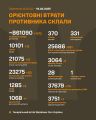ОДЕСА, 18 ЛЮТОГО 2025 РОКУ, КОНТЕКСТ-ПРИЧОРНОМОР’Я – Зведення Генерального штабу Збройних Сил України про бойові втрати російських окупантів внаслідок агресії проти нашої країни. Як повідомляє кореспондент ІА «Контекст-Причорномор’я», про це йдеться на Фейсбук-сторінці Генерального штабу ЗСУ. У повідомленні Міноборони України сказано: Загальні бойові втрати противника з 24.02.22 по 18.02.25 орієнтовно склали / The estimated total combat losses of the enemy from 24.02.22 to 18.02.25 особового складу / personnel ‒ близько/ about 861090 (+1170) осіб / persons, танків / tanks ‒ 10101 (+12) од, бойових броньованих машин / troop-carrying AFVs ‒ 21075 (+12) од, артилерійських систем / artillery systems – 23275 (+53) од, РСЗВ / MLRS – 1285 (+2) од, засоби ППО / anti-aircraft systems ‒ 1068 (+1) од, літаків / aircraft – 370 (+0) од, гелікоптерів / helicopters – 331 (+0) од, БПЛА оперативно-тактичного рівня / UAV operational-tactical level – 25586 (+181), крилаті ракети / cruise missiles ‒ 3064 (+1), кораблі /катери / warships / boats ‒ 28 (+0) од, підводні човни / submarines — 1 (+0) од, автомобільної техніки та автоцистерн/ vehicles and fuel tanks – 37679 (+74) од, спеціальна техніка / special equipment ‒ 3751 (+1) Дані уточнюються / Data are being updated. Бий окупанта! Разом переможемо!/ Fight the invader! Together we will win! |