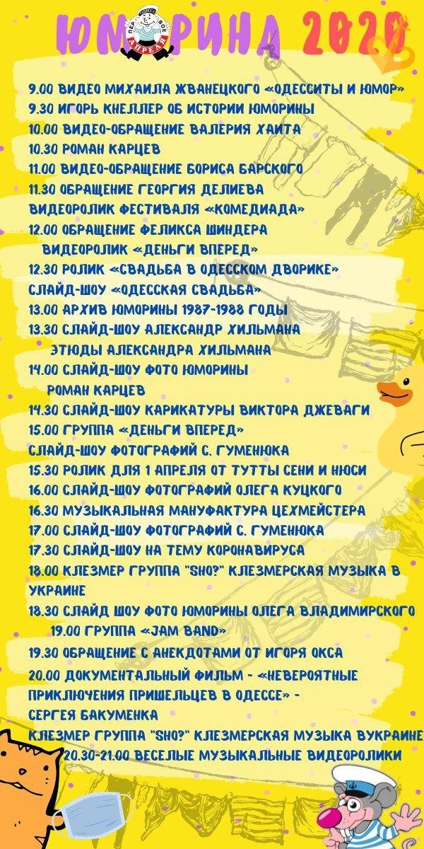 ОДЕССА, 01 АПРЕЛЯ 2020 ГОДА, КОНТЕКСТ-ПРИЧЕРНОМОРЬЕ — Из-за карантинных мер в связи с коронавирусом Одесса в нынешнем году проводит Юморину «на удаленке». Об этом ИА «Контекст-Причерноморье» сообщили в департаменте информации Одесского горсовета. В День смеха начиная с 9:00 утра, на официальном сайте Департамента культуры и туризма Одесского городского совета, а также на Фейсбук-странице департамента стартует Юморина «на удаленке». |