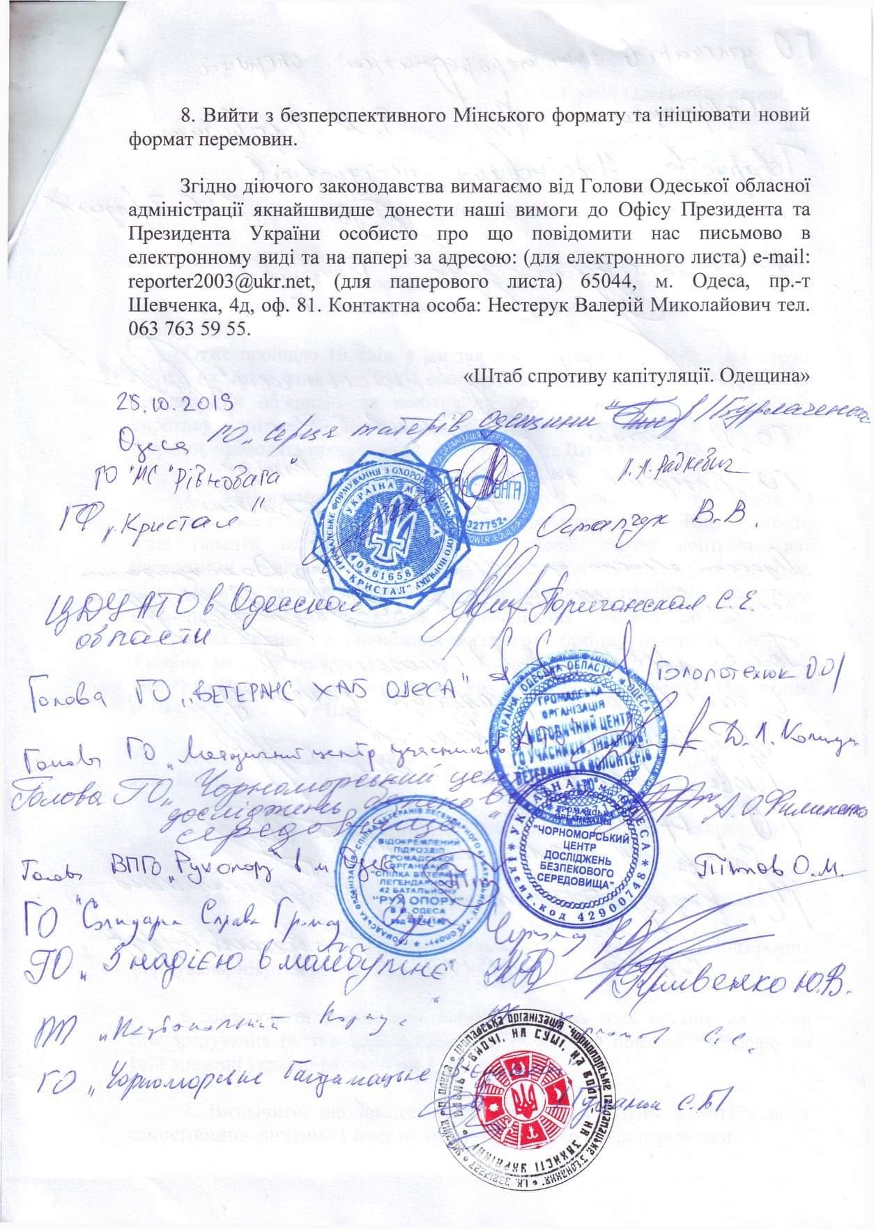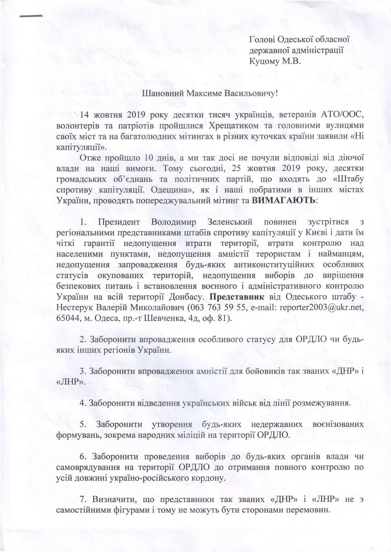 ОДЕССА, 25 ОКТЯБРЯ 2019 ГОДА, КОНТЕКСТ-ПРИЧЕРНОМОРЬЕ — «Штаб сопротивления капитуляции. Одесчина» провел предупредительный митинг «Нет капитуляции» возле Одесской облгосадминистрации, передает корреспондент ИА «Контекст-Причерноморье» Около ста человек – представителей ветеранских и патриотических общественных организаций региона, объединённых в «Штаб сопротивления капитуляции. Одесчина» провели утром 25 октября предупредительный митинг под стенами Одесской облгосадминистрации. Участники акции требовали от Президента Украины чётких гарантий сохранения украинских территорий и контроля над населёнными пунктами, недопущения амнистии террористам и наёмникам, а так же запрета отвода украинских войск со своих позиций. Пикетчики обратили внимание, что с 14 октября, когда представители региональных штабов выступили в Киеве в ходе многотысячного митинга с едиными требованиями против так называемой «формулы Штайнмайера», прошло уже 10 дней, но действующая власть никаким образом не дала чёткого ответа на запрос общества. Поэтому 25 октября по всей стране региональные штабы выступили с повторным требованием к Президенту Украины разъяснить свою позицию относительно планов мирного урегулирования. Одним из инструментов такой работы, по мнению митингующих, мог бы стать общенациональный круглый стол с представителями региональных штабов движения «Нет капитуляции». |