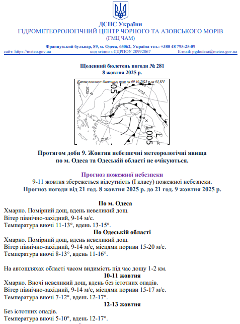 ОДЕСА, 08 ЖОВТНЯ 2025 РОКУ, КОНТЕКСТ-ПРИЧОРНОМОР’Я — За інформацією Гідрометцентру Чорного та Азовського морів, протягом доби 9 жовтня в Одесі вдень невеликий дощ, небезпечні метеорологічні явища по м. Одеса та Одеській області не очікуються. Про це ІА «Контекст-Причорномор'я» повідомили в департаменті інформації Одеської міськради (телеграм-канал). В повідомленні міськради сказано: Гідрометцентр Чорного та Азовського морів Протягом доби 9 жовтня небезпечні метеорологічні явища по м. Одеса та Одеській області не очікуються. ПРОГНОЗ ПОГОДИ від 21 год. 8 жовтня 2025 р. до 21 год. 9 жовтня 2025 р. По м. Одесі Хмарно. Помірний дощ, вдень невеликий дощ. Вітер північно-західний, 9-14 м/с. Температура вночі 11-13°С, вдень 13-15°С. По Одеській області Хмарно. Помірний дощ, вдень невеликий дощ. Вітер північно-західний, 9-14 м/с, місцями пориви 15-20 м/с. Температура вночі 8-13°С, вдень 11-16°С. На автошляхах області часом видимість під час дощу 1-2 км. 10-11 жовтня Хмарно. Вночі невеликий дощ, вдень без істотних опадів. Вітер північно-західний, 9-14 м/с, місцями пориви 15-17 м/с. Температура вночі 7-12°С, вдень 12-17°С 12-13 жовтня Без істотних опадів. Температура вночі 5-10°С, вдень 12-17°С. Одеська мерія нагадує одеситам і гостям міста про необхідність стежити за змінами погодних умов, бути пильними, при погіршенні погоди обмежити переміщення та поїздки містом, особливо літніх осіб, дітей і вагітних жінок, обережно пересуватися під деревами – внаслідок сильного поривчастого вітру та дощу можливе падіння гілок і кабелів. Прохання не залишати транспортні засоби під деревами, лініями електропередач та на решітках дощоприймачів. Небезпека знаходження в пляжній зоні є надто високою. Через шторм у Чорному морі посилюється мінна небезпека. Є висока вірогідність зриву морських мін з якорів та прибиття до берега, а також їхнє дрейфування вздовж узбережжя. І цілком імовірним є неконтрольований підрив міни, особливо в штормову погоду. У разі виявлення морської міни (мін) або предметів, схожих на них, у жодному разі їх не можна чіпати. Необхідно невідкладно повідомляти за номером 102. * * * Рятувальна служба — 101 Цілодобова медична швидка допомога — 103 Патрульна служба МВС України в Одесі — 102 Оперативний міський центр «Швидка комунальна допомога» – 15-01 |
