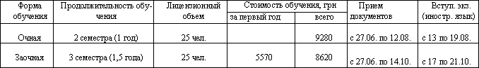 Документы, необходимые для поступления: •оригиналы или нотариально заверенные копии дипломов бакалавра и/или специалиста/магистра, приложений к ним (диплома о высшем образовании и приложения к нему старого образца) •копия паспорта •копия справки о присвоении идентификационного кода •4 фото 3x4 •медицинская справка формы 086-0 (для поступления на дневную форму обучения) •справка с места работы (для оформления вызова на учебно-экзаменационную сессию). Зачисление осуществляется по итогам конкурсного отбора, для которого используется средняя сумма балов из дополнений к дипломам о базовом высшем образовании и/или полном высшем образовании (по пятибальной шкале), по персональному выбору поступающего, после оформления и оплаты договора на обучение. Допуск для участия в конкурсе осуществляется на основании получения позитивного результата на Вступительном испытании по английскому языку. Студентам заочной формы обучения предоставляется оплачиваемый отпуск для участия в сессиях (40 дней в год).