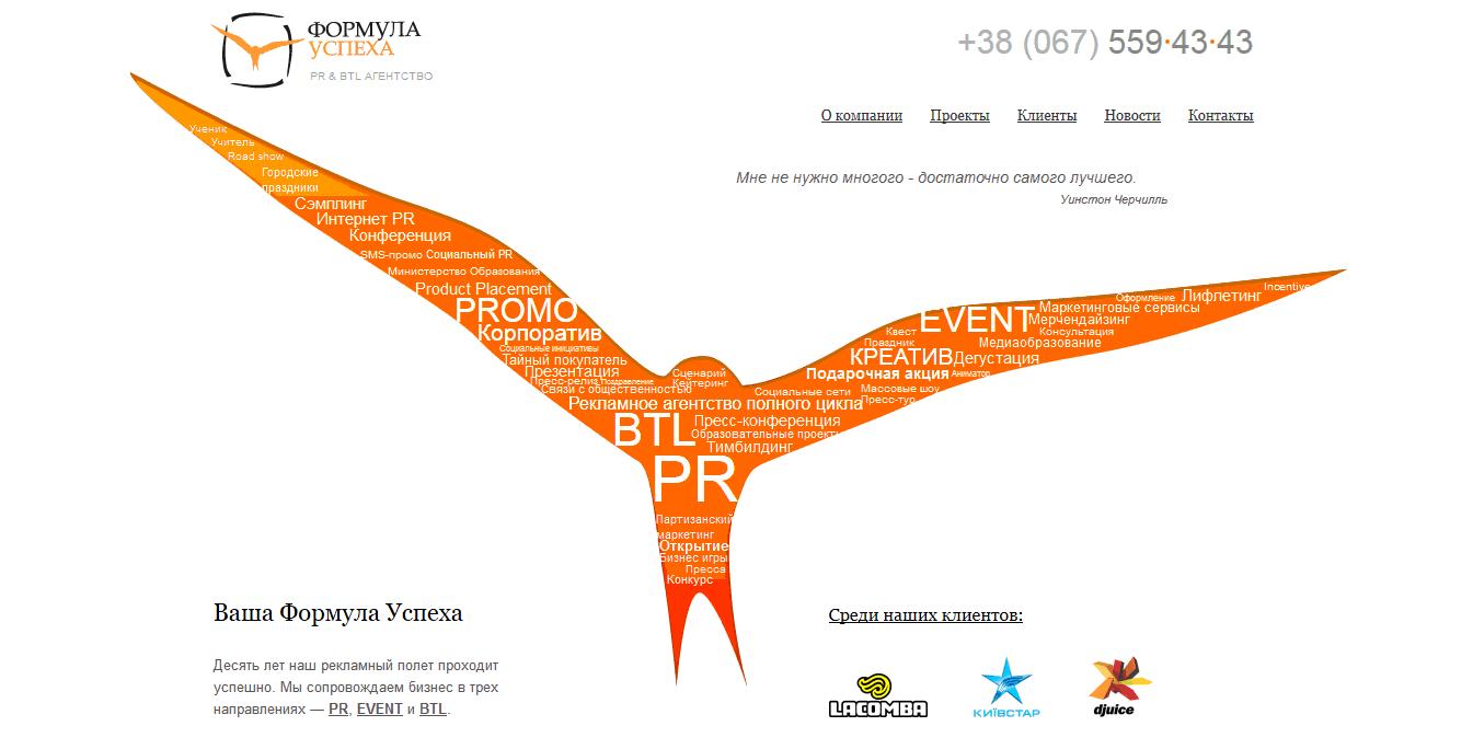 Начал свою работу обновленный сайт PR & BTL агентства «Формула успеха». Новый дизайн и юзабилити интернет-ресурса соответствуют последним тенденциям. Запуск нового сайта приурочен к 10-ти летию агентства. Новый функциональный ресурс http://promo-ua.com/ отличается простотой в дизайне и максимальным удобством для посетителей. Птица, центральный элемент логотипа агентства, выполняет роль навигационного терминала, который позволяет в один клик перейти к информации о конкретных услугах агентства, а также ознакомиться с реализованными проектами в выбранной сфере маркетинга. Сайт «Формулы успеха» задуман не только для презентации агентства, но и как информационная площадка для публикации актуальных маркетинговых событий в жизни компании, ее клиентов, партнеров и коллег в сфере BTL. Предыдущий сайт прослужил агентству 8 лет. Незаменимый маркетинговый инструмент устарел: он требовал значительной технической, информационной и стилистической доработки. Ирина Лескова, директор PR & BTL агентства «Формула успеха»: «Создание нового сайта можно сравнить с полноценным ребрендингом. Это стремление создать совершенный, красивый продукт, который более удобен в использовании, элегантен по форме и лаконичен по содержанию. Когда 10 лет назад открывалось агентство, было очень важно определиться с позиционированием: что о себе говорить и какую стратегию выбрать. Сейчас компания перешагнула порог первого десятилетия, и мы говорим только о самом главном». Важную роль в проектировании и запуске нового сайта сыграли наши партнеры NETOCRAT Communications и лично директор компании Борис Ходорковский. История успешного сотрудничества «Формулы успеха» и Бориса Ходорковского длится более 9-ти лет. Консультации в области последних технологий социальных коммуникаций, экспертное мнение в вопросах юзабилити, Интернет-маркетинга, SEO-оптимизации и продвижения позволили вывести сайт на совершенно новый уровень эффективности, а также облегчить работу с web-разработчиками. Директор Netocrat Communications Борис Ходорковский: „Работа с «Формулой успеха», PR-поддержка значимых проектов агентства и его клиентов, — всегда не только серьезный вызов для нашей команды, но и профессиональное удовольствие от результатов синергии двух компаний, которые выбрали путь развития рынка, внедрения новых технологий и работы с реальными бизнес-целями заказчика. Новый сайт «Формулы» — это не просто дань времени и моде. Это шаг к прямому взаимодействию с целевой аудиторией компании. Однако, это первый шаг. Впереди период внимательного изучения взаимоотношений аудитории с web-сайтом, доработка и доведение до максимального удобства и эффективности информационных каналов, центром которых и станет новый сайт компании.“ Длительная подготовка проекта к запуску включала в себя тщательный подбор web-студии. Наш выбор основывался на соотношении цена-качество, а также на опыте работы с нестандартными задачами. В итоге партнером создания нового сайта стала компания «DaVinci-design». Руководитель студии Мария Стрелецкая: „Мы рады любому сотрудничеству, но особенно такому, которое обоюдно ведется на высоком профессиональном уровне и позволяет выполнить поставленные в начале проекта задачи на все 100. Именно такой была работа над сайтом PR & BTL агентства «Формула успеха». Совместная работа с «Формулой успеха» доставила