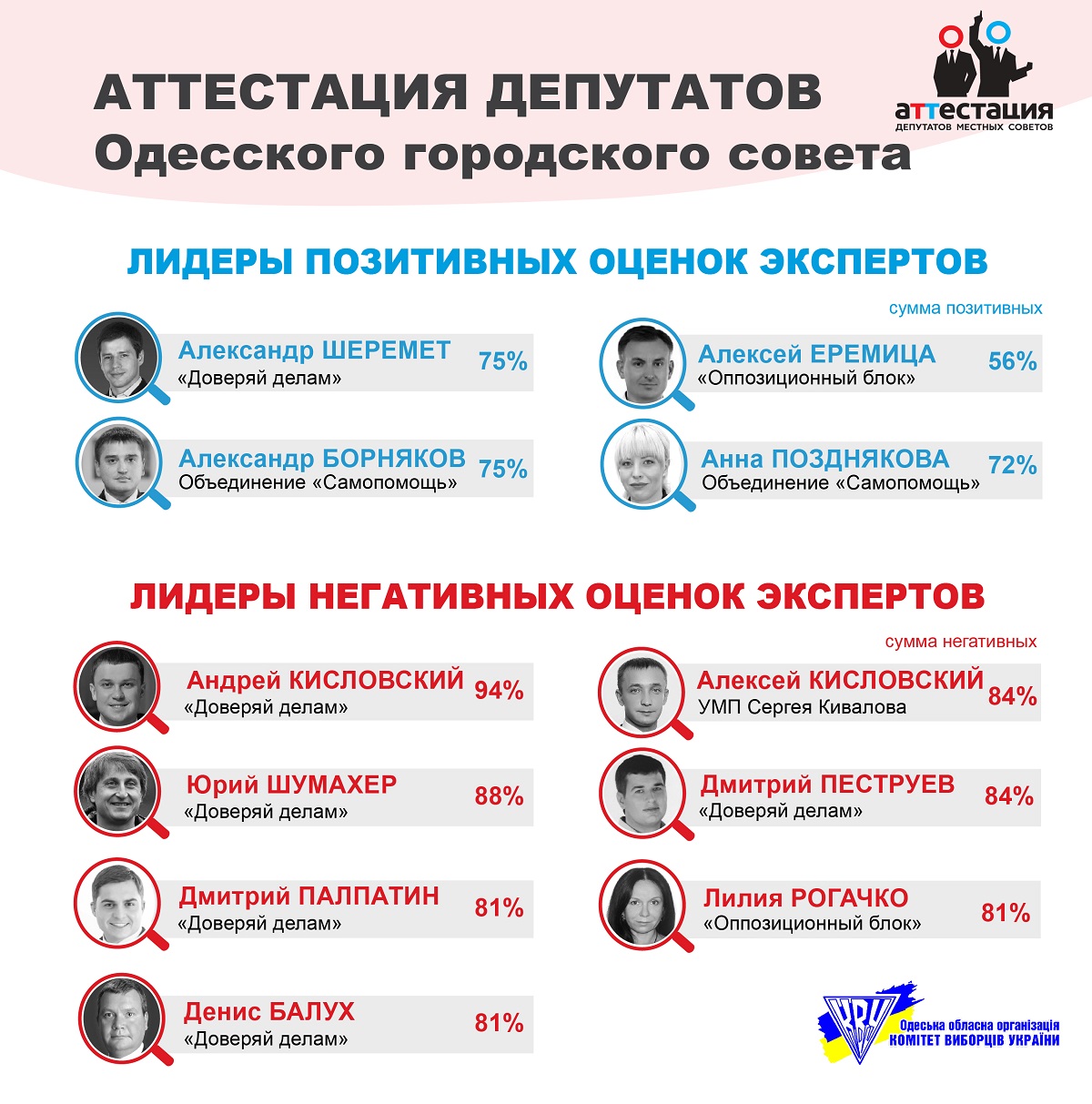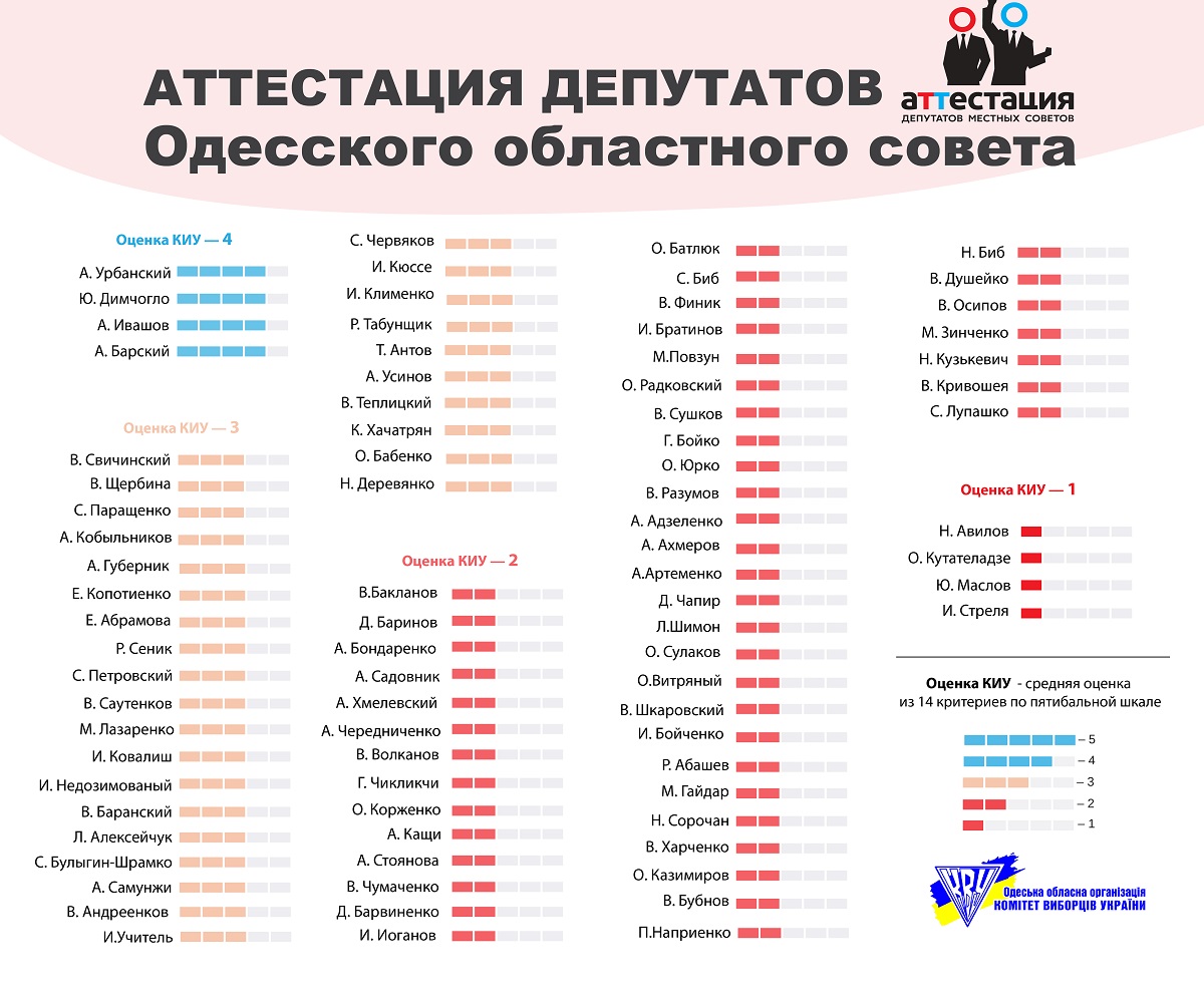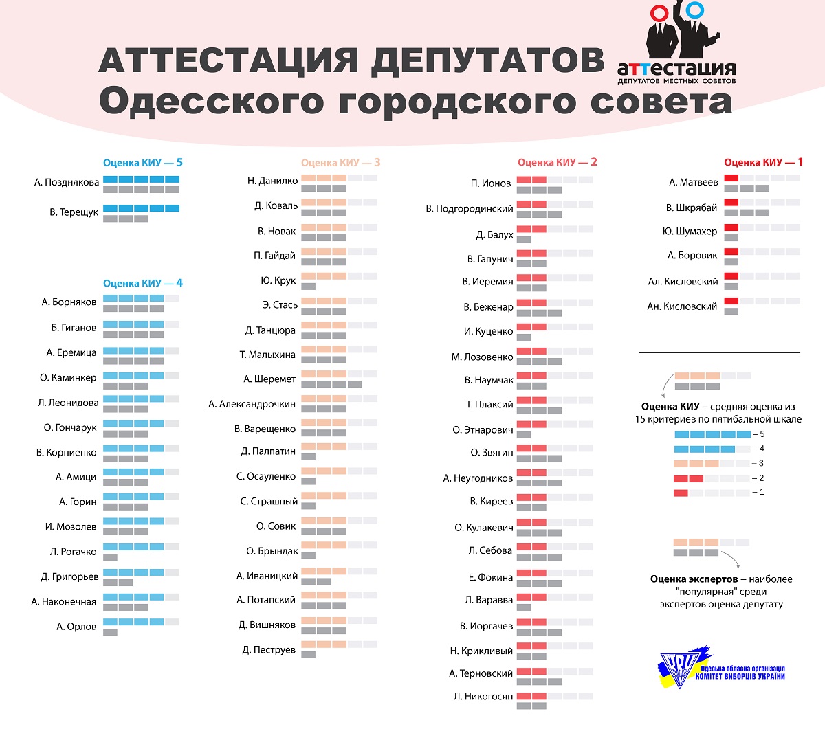 Справочная информация об оценивании: Персональное оценивание каждого депутата Одесского городского и областного совета осуществлялось по заранее заданному набору критериев, на основе которых представляется возможным дать максимально полную и в то же время объективную оценку деятельности депутатов. В оценку были включены критерии презентации информации о депутатах на официальных сайтах советов, информирование о месте и времени проведения приема, а также регулярного проведения приема избирателей, взаимодействия с избирателями в социальных сетях. Добропорядочность депутатов оценивалась по критериям дисциплины посещения пленарных заседаний и заседаний постоянных комиссий, добровольного раскрытия информации о доходах, голосования при рассмотрении спорных проектов решений и поведения в случаях возникновения конфликта интересов. Наконец, в рамках реализации депутатами принципа подотчетности, оценивалось проведение отчетной кампании на открытых встречах с избирателями, публикация отчетов, а также соответствие содержания отчетов требования закона «О статусе депутатов местных советов». Экспертам было предложено оценить каждого депутата Одесского городского совета по шкале от 1 до 5 баллов, где 5 — максимальная оценка. Наиболее «популярная» среди экспертов оценка каждому депутату представляется как оценка экспертами депутату. Проект «Атестація депутатів місцевих рад. Одеська область», що здійснюється ООО ВГО КВУ за підтримки Міжнародного фонду «Відродження», направлено на вдосконалення діяльності новообраних депутатів 8 місцевих рад Одеської області за допомогою проведення персонального оцінювання діяльності місцевих депутатів на предмет відповідності їх діяльності параметрам відкритості, прозорості, підзвітності та доброчесності протягом першого року повноважень, а також на підвищення поінформованості виборців про діяльність їх місцевих депутатів.