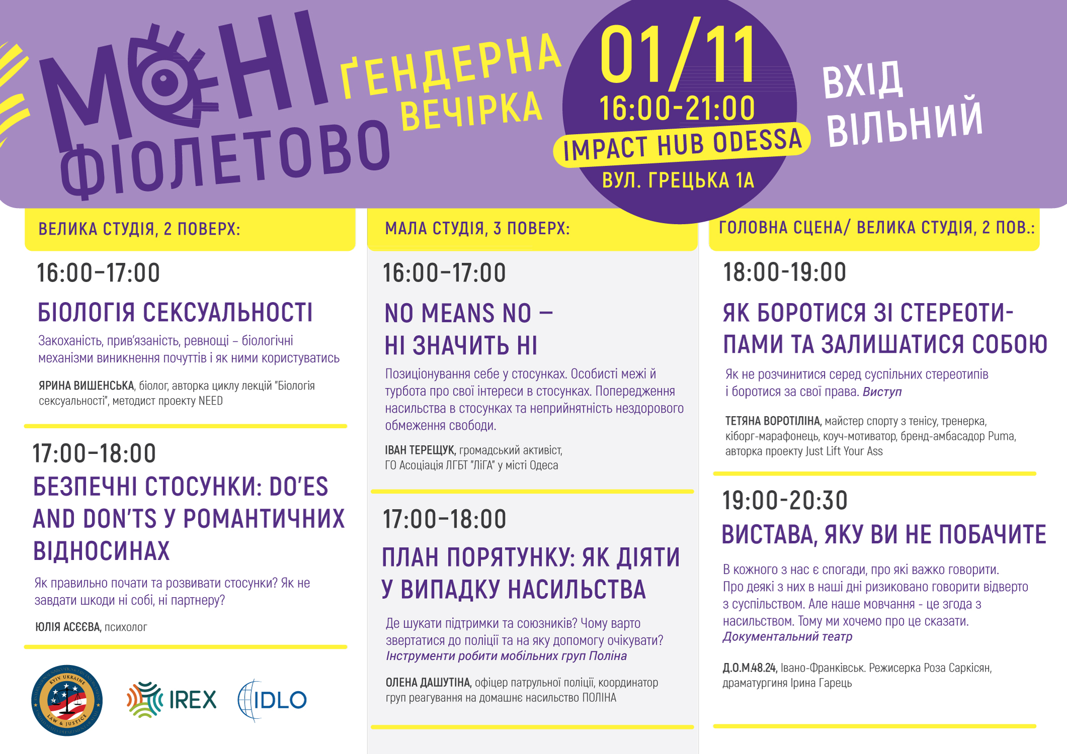 1 листопада пройде Мені фіолетово — гендерна вечірка про здорові стосунки та свободу бути собою. о 16:00 ⚡️Прокачайте навички в зоні лекторію: спікери відверто та зрозуміло розкажуть про природу романтичних почуттів, особисті кордони, як вберегтись від насильства, і як нарешті побудувати гармонійні стосунки з партнером та собою. о 18:00 ⚡️Отримайте потужний заряд натхнення від Тані Воротіліної на public talk. о 19:00 ⚡️Подивіться виставу у жанрі документального театру. «Вистава, яку ви не побачите»- це чесна розповідь про насильство у стосунках, боротьбу та перемоги звичайних людей. Для тих, хто не ховає голову в пісок та готовий до незручних тем. ⚡️разом з БО «100 відсотків життя. Одеса» отримайте безкоштовну консультацію щодо ВІЛ та пройдіть тестування на ВІЛ швидкими тестами.